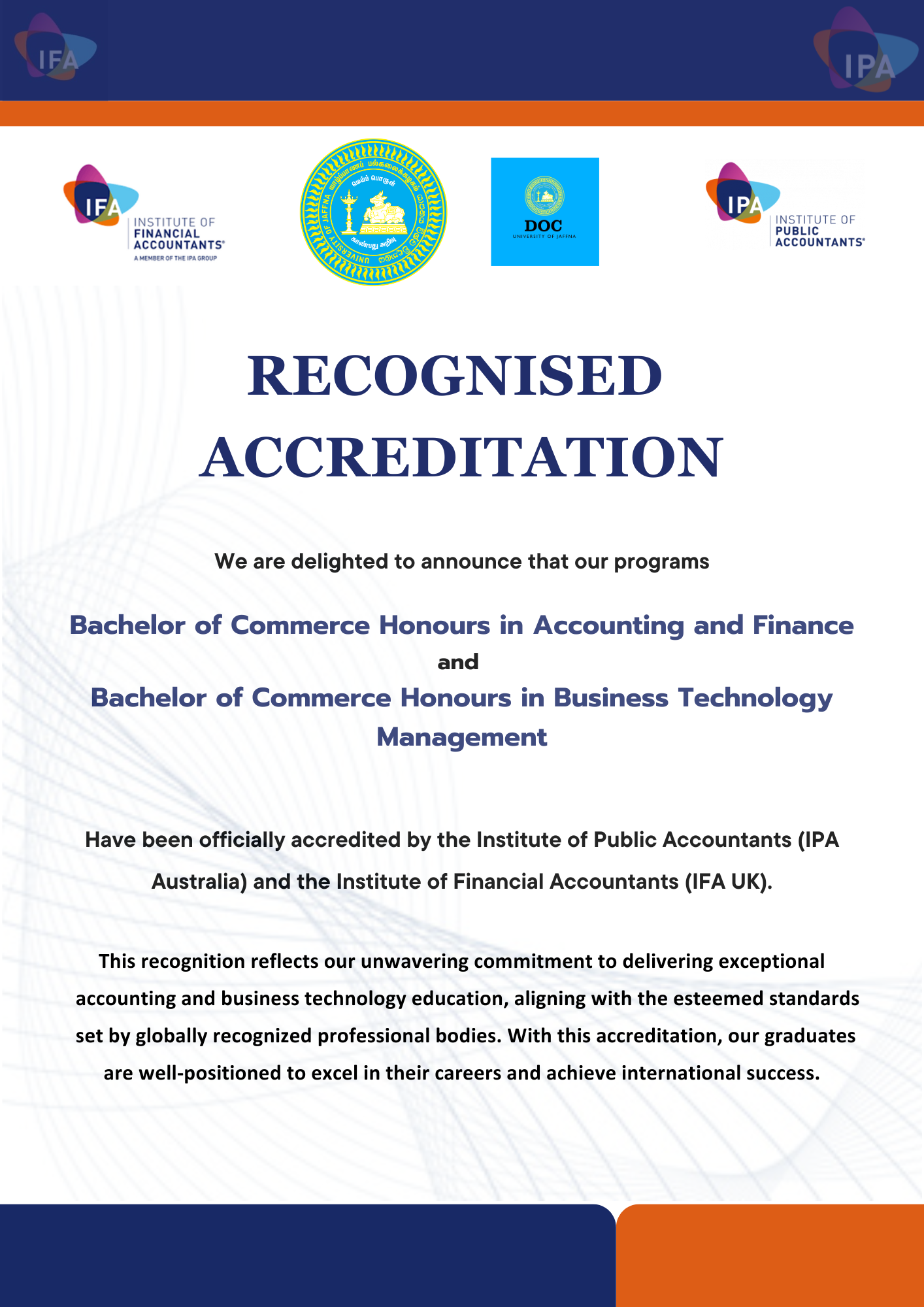 Accreditation by the Institute of Financial Accountants (IFA) and the Institute of Public Accountants (IPA) Accreditation by the Institute of Financial Accountants (IFA), Institute of Public Accountants (IPA), Certified Practicing Accountant (CPA), and Association of Chartered Certified Accountants (ACCA)